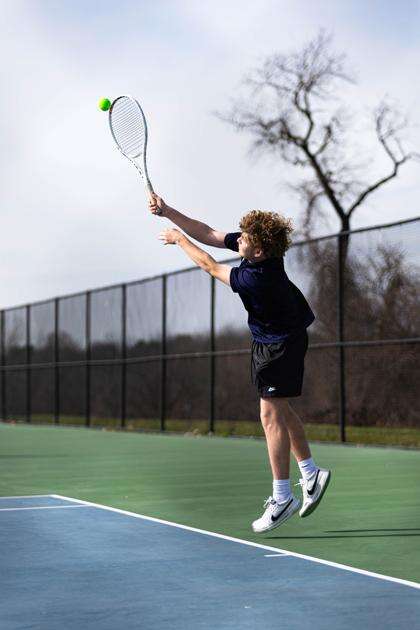 PRESS PHOTO BY GRACE DEPPEChristian Marinos serves during a recent Salisbury tennis match. As the Falcons’ top singles player, Marinos faces the opposing team’s top player in every match.